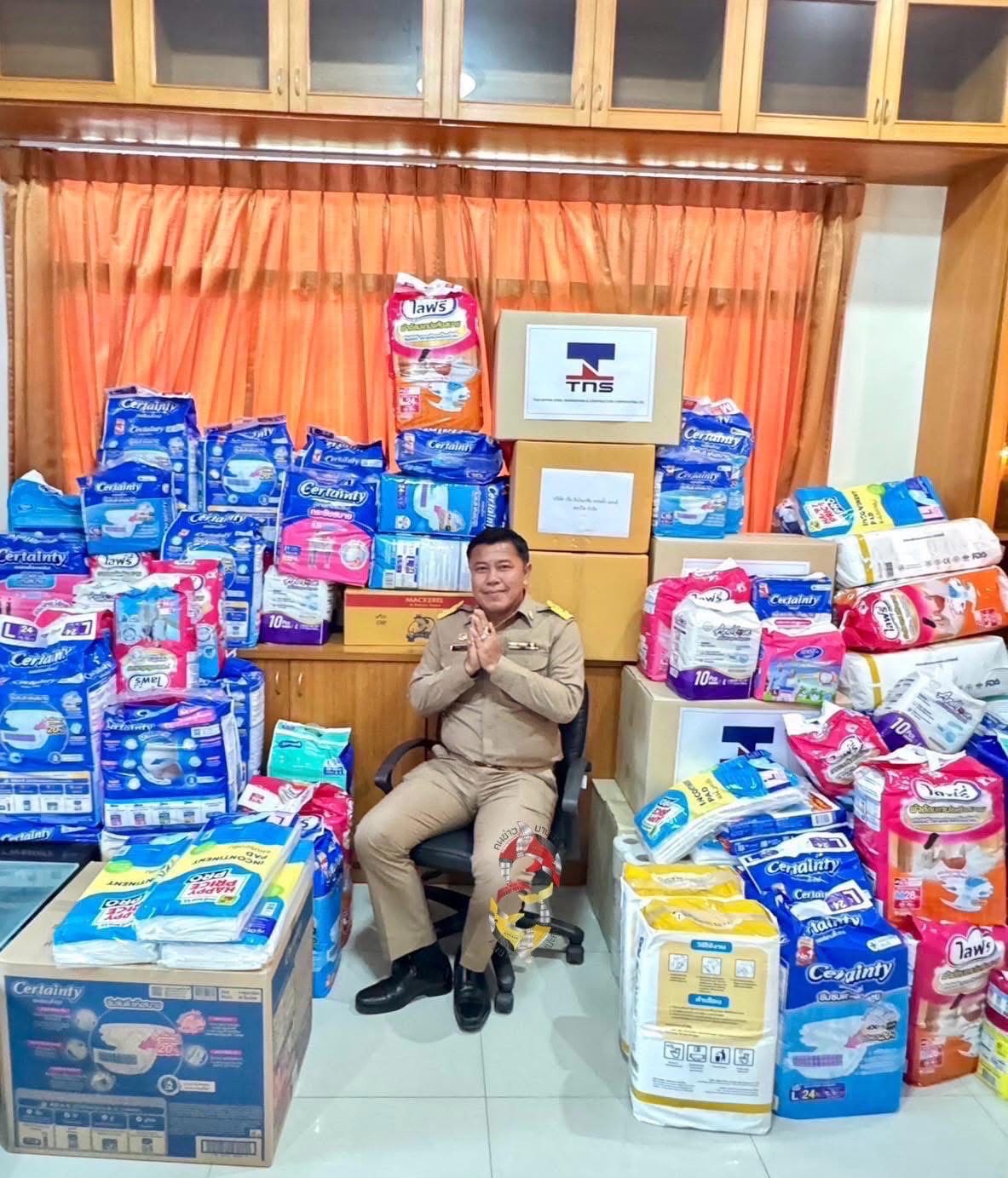 June 6, 2025 – PA&CA Team, represented TNS donated 40 packs of adult diapers to the Mayor of Bang Pakong Phromthep Rangsan Subdistrict Municipality at the municipality office. These supplies will be distributed to elderly residents in the Bang Pakong community who are in urgent need.