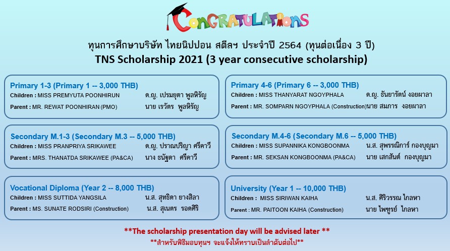 May 2021 – Congratulations to all following successful scholars who are our TNS employees’ children and they will be given 3 year consecutive scholarship. The management team have congratulated all successful scholars’ parent. This year, there are 6 qualified scholars as followings: