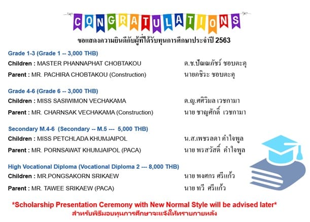22 July 2020 – Mr.Hiroyuki Kurosaki – CEO has presided at TNS Scholarship Presentation 2020 at Bangpakong Technical Training Center Building 6, 2nd Floor. The management team and employees’ supervisors have also joined and congratulated all successful scholars’ parent. This year, there are 4 qualified scholars as followings:
